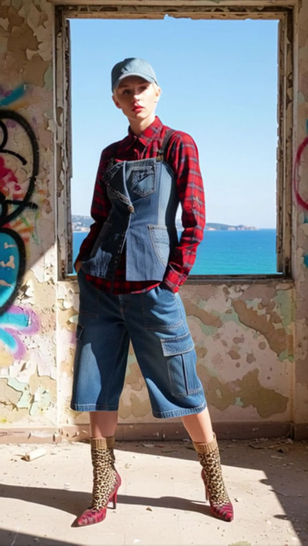 Due modelli posano in una stanza abbandonata con pareti scrostate e graffiti colorati. Indossano giacche in denim con maniche a quadri, camicie mimetiche, bermuda in denim con dettagli patchwork e calzini verdi. La modella ha scarpe con tacco marroni, il modello indossa mocassini marroni e un cappellino in denim. Il look esprime lo stile punk, militare e sostenibile della collezione Punk-à-Porter di Marita Balàzs.