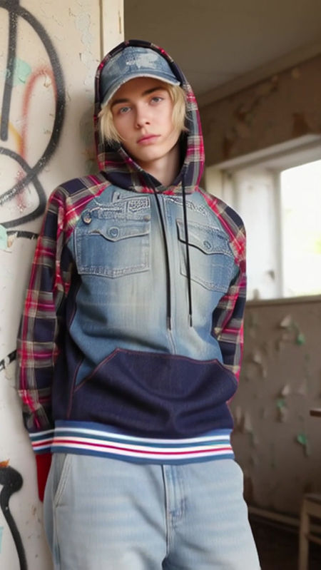 Modella posa in una stanza abbandonata con pareti scrostate e graffiti, indossando una felpa con cappuccio in denim e tartan rosso-blu, pantaloni cargo in denim con inserti tartan, guanti rossi, cappellino in denim e scarpe alte rosse. Il look esprime lo stile punk, audace e sostenibile della collezione Punk-à-Porter di Marita Balàzs.