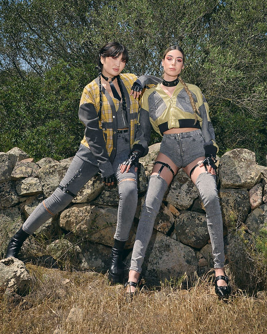 Tre modelle in outfit denim audaci e distintivi, posate su una roccia al tramonto, esprimono un'estetica punk e un forte senso di stile della collezione Punk-á-Porter, celebrando la libertà e l'individualità.