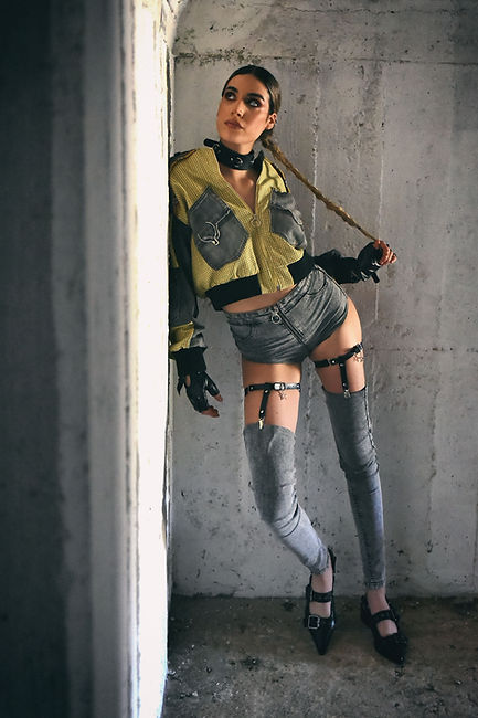 Modella in giacca denim con dettagli distintivi e calze a rete, in piedi accanto a una porta metallica, trasmette un'immagine di forza e ribellione della collezione Punk-á-Porter.